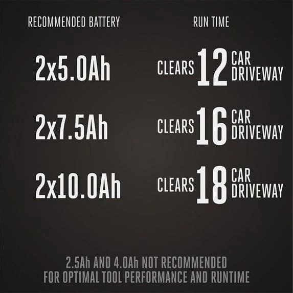 - Recommend for use with two EGO 56V 5.0 Ah ARC Lithium batteries to clear 8″ of snow on a 12 car driveway.