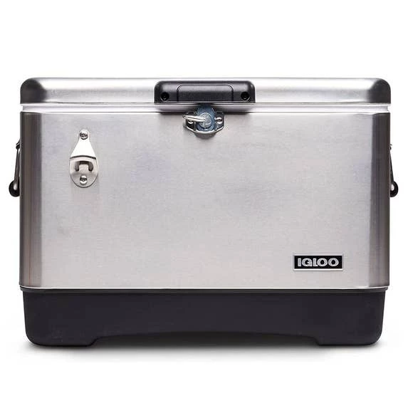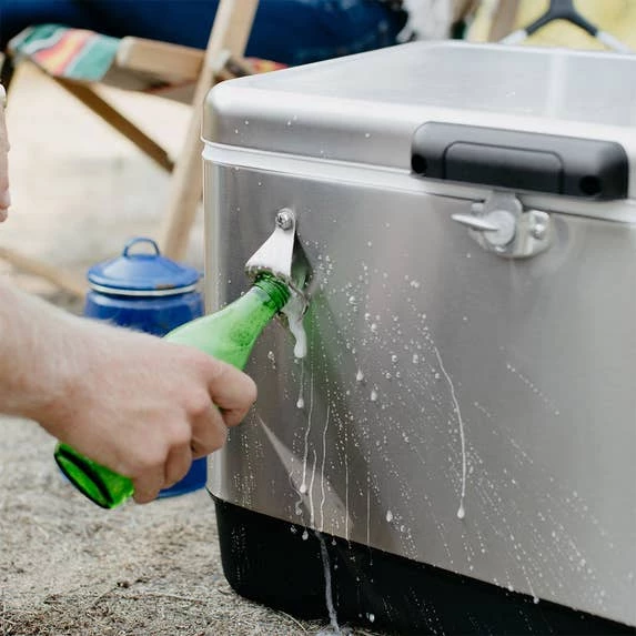 - Convenient stainless steel bottle opener built into cooler exterior.