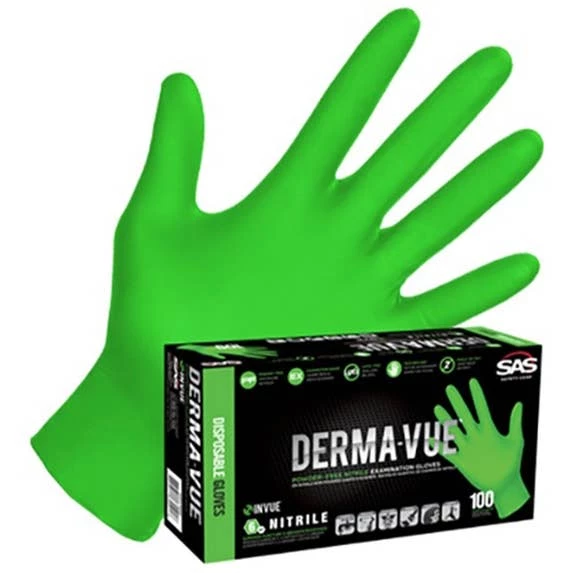 ** LIMIT 10 PER ORDER ** SAS Safety Corp. Derma-Vue Extra Strength Disposable Nitrile Gloves Same Formula as RAVEN Gloves but in a High Visability Green Powder-free exam grade nitrile Thickness: 6mil Non-latex Examination Grade Single Use Outstanding strength; wear and dexterity Fully textured for enhanced gripping power 100 gloves per box
