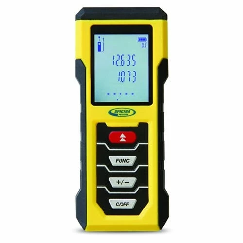 The Spectra Precision QM20 Laser Distance Meter is compact; fitting comfortably in your hands and in your pocket or tool belt. The measuring range is 165 feet (50 m) and functions include indirect measurements using the Pythagorean mode. A tilt sensor is visible on the LCD. Area and volume calculations are also possible.